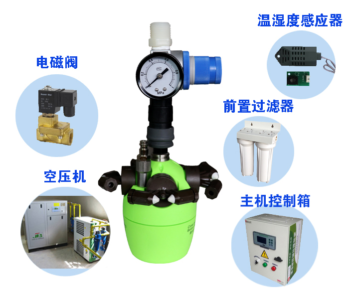 利用空壓機氣體將水霧化,水霧顆粒細、揮發快、效率高。